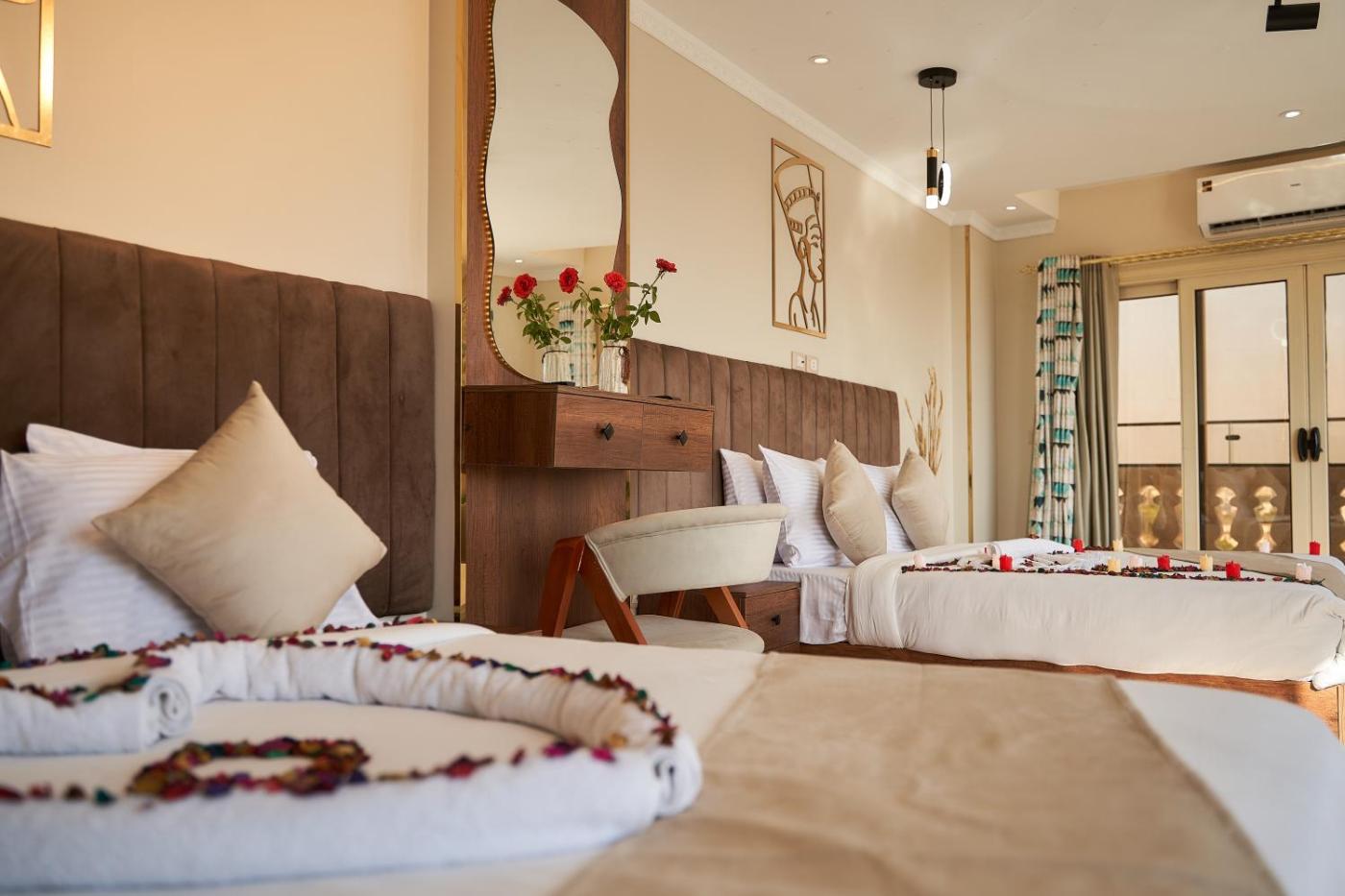 Panoramic Twin Room with Grand Egyptian Museum View. Guests will have a special experience as this twin room provides a fireplace. Offering free toiletries and bathrobes, this twin room includes a private bathroom with a walk-in shower, a bidet and a hairdryer. Guests can make meals in the kitchenette that has a stovetop, a refrigerator, kitchenware and a tea and coffee maker. The air-conditioned twin room offers a flat-screen TV with streaming services, a private entrance, soundproof walls, a minibar as well as mountain views. The unit has 2 beds.