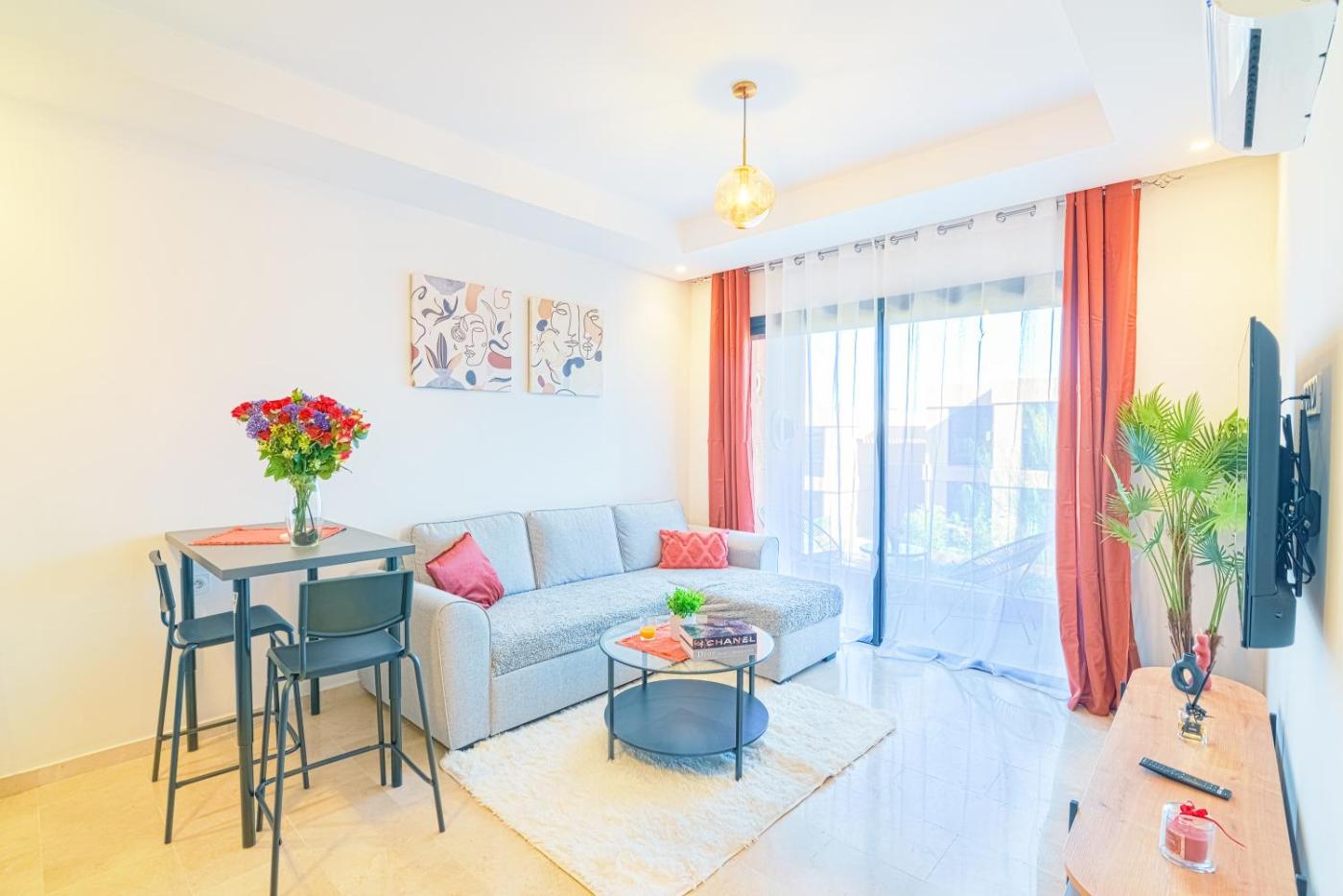 The apartment has 1 bedroom, 1 bathroom, bed linen, towels, a flat-screen TV with streaming services, a dining area, a fully equipped kitchen, and a terrace with pool views. The air-conditioned unit at the property features a shower and a dressing room. This apartment is non-smoking and soundproof.