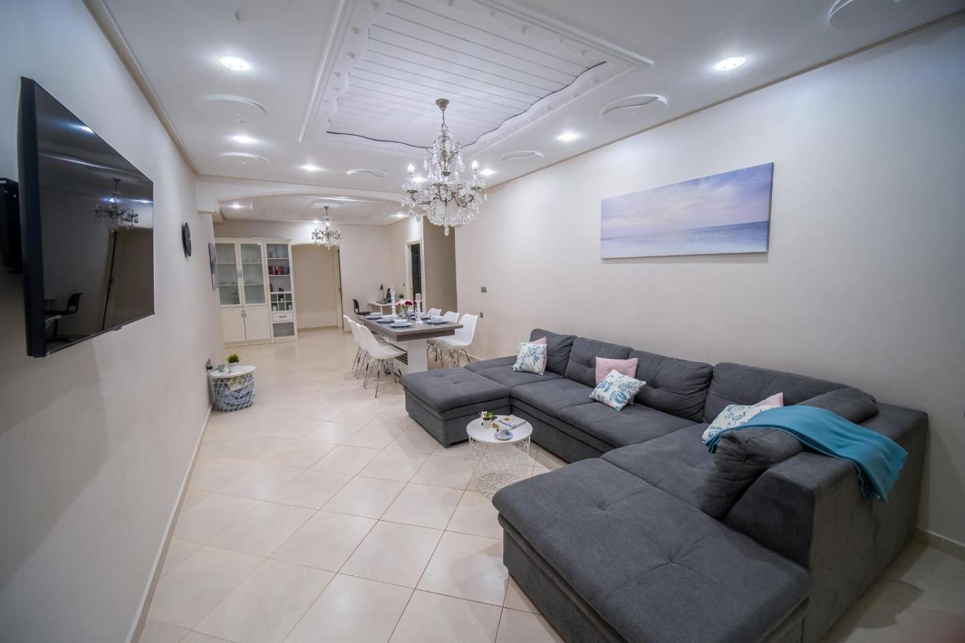 Two-Bedroom Apartment. This spacious apartment consists of 1 living room, 2 separate bedrooms and 2 bathrooms with a shower and a bidet. The fully equipped kitchen has a stovetop, a refrigerator, kitchenware and a microwave. This apartment is air-conditioned and features a seating area with a flat-screen TV, a washing machine, a tea and coffee maker, a dining area, as well as a wardrobe. The unit offers 3 beds.